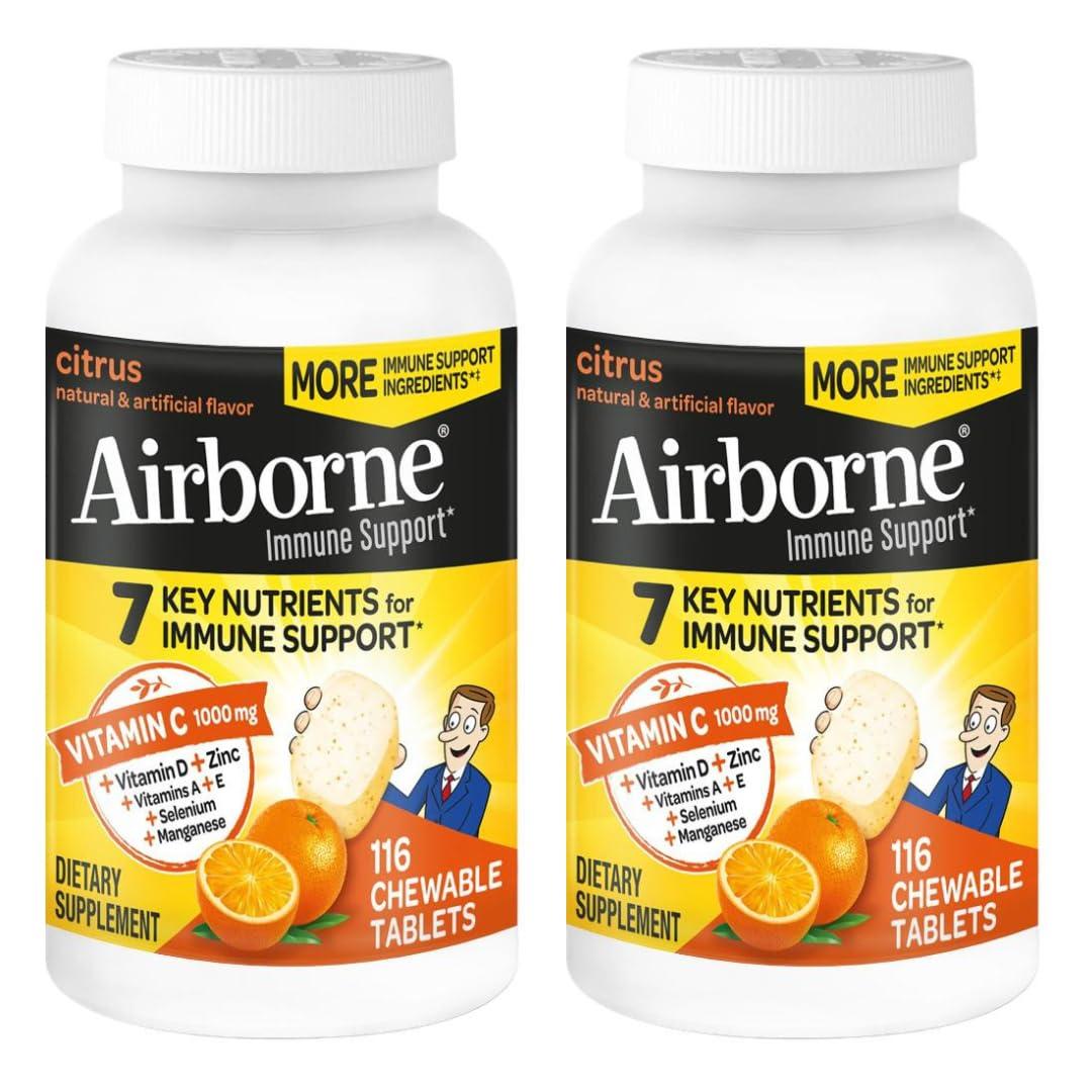 Introducing Airbornes Most Complete Immune Support Formula Yet! Airbornes Citrus Chewable tablets are a delicious and easy way to give you and your familys immune system MORE of what it wants with seven key ingredients: vitamin C, vitamin D, vitamin A, vitamin E, Zinc, Selenium, and Manganese. Plus, each daily serving also contains our original Herbal Blend which includes Echinacea and Ginger! The best part? Our Chewables are not only delicious but easy-to-take (theres no water needed).