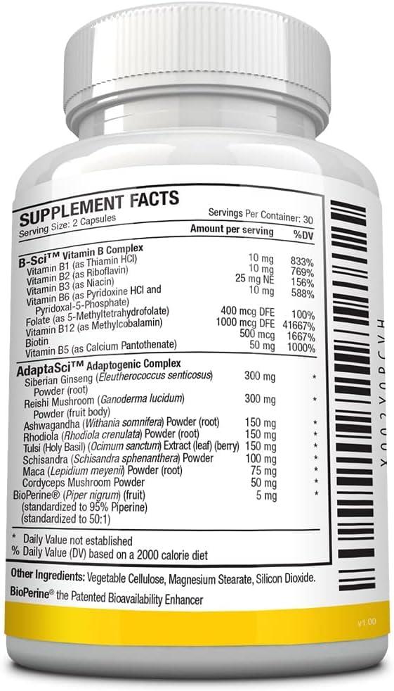 Approved Science Energysyl - Caffeine Free - with Adaptogens, B Vitamins, and Bioperine - 3 Month Supply - 180 Capsules