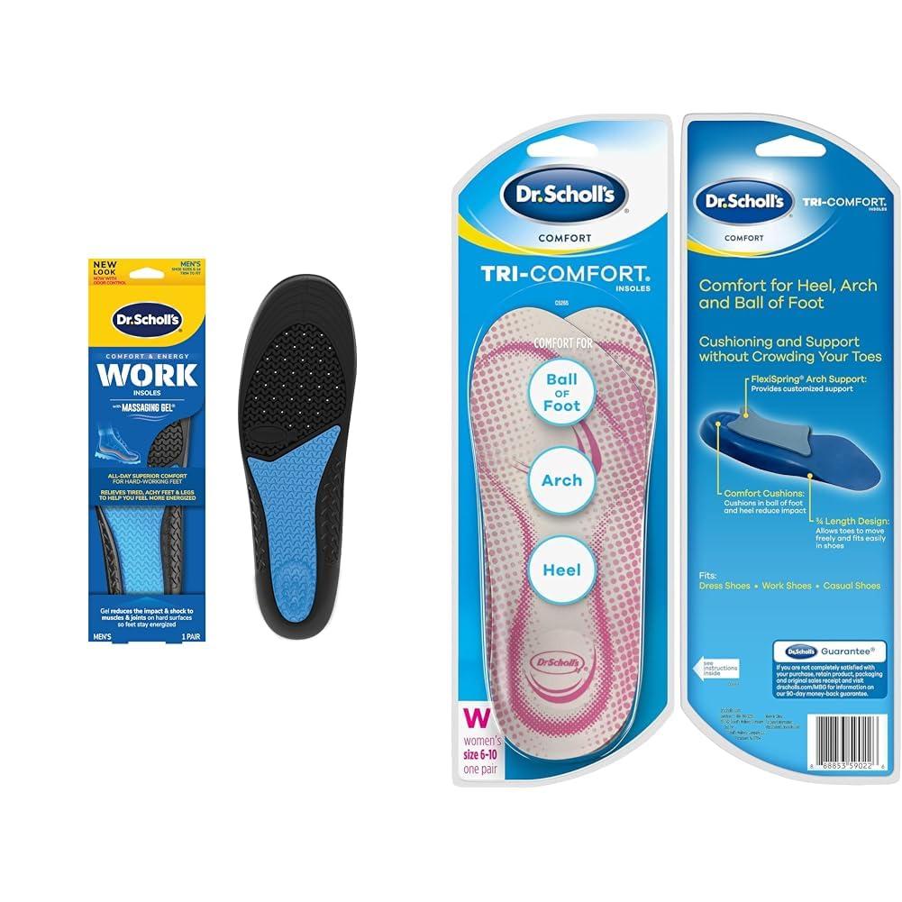 The Dr. Scholl's Work and Comfort Insoles Bundle includes one pair of superior comfort insoles designed for men who are on their feet all day at work, and one pair of cushioned insoles made to provide women all-day comfort. The men's insoles feature extended Massaging Gel cushioning to absorb shock and impact, keeping hardworking feet energized. They adapt to the contours of men's feet, providing responsive support and freshness with Polygiene odor control. The women's 34-length insoles offer targeted soft foam cushioning to relieve pressure on the heel, arch, and ball of the foot. Their flexible arch adds stability while avoiding cramped toes. Both products aim to eliminate foot fatigue and discomfort using thoughtfully engineered designs backed by science and clinical testing. Together they cover a range of foot types and comfort needs for active working men and women. The bundle allows customers to address foot pain and energize their workday.