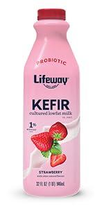 Our most popular product line, Lifeway Lowfat Kefir is up to 99% lactose-free, gluten-free, and made with all natural, non-GMO ingredients. Kefir is a tart and tangy cultured dairy drink packed with protein, calcium, and 12 live and active probiotic cultures. Lifeways Strawberry Lowfat Kefir Pack of 4 Bottles (32 oz) is lightly sweetened with cane sugar. Blend into a smoothie, whip into a dip, or simply pour yourself a glass! After all, it is the Champagne of Dairy.