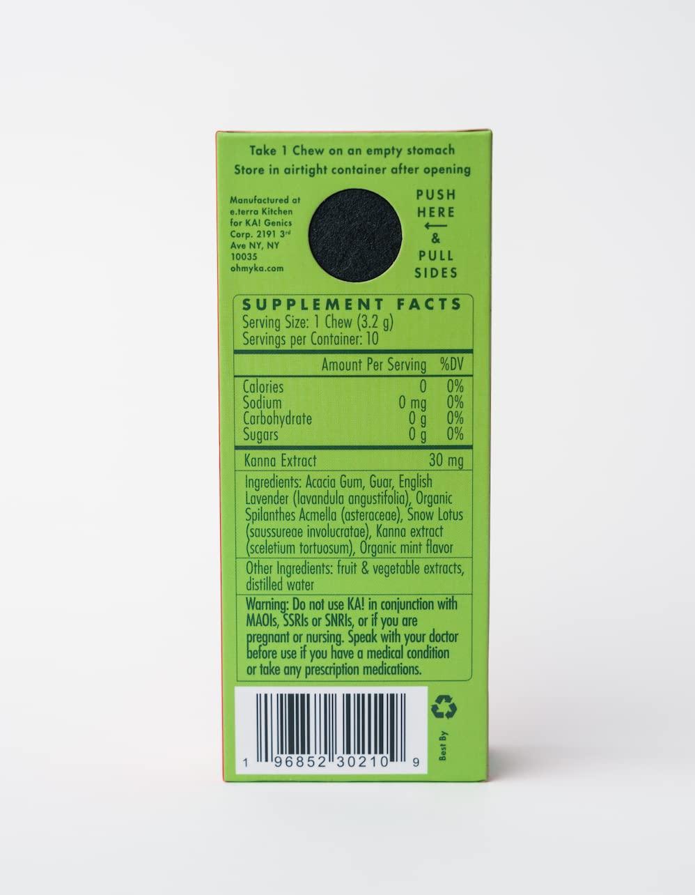- FAST-ACTING KANNA CHEWS. Each pack contains 10 Chews (servings). Each Chew contains 30mg of standardized, high potency Kanna extract. Serving size for adults: 1 Chew on an empty stomach (3 Chews max per 24 hour period). To experience the transformational effects, we recommend taking KA! Daily Chews every day, for a minimum of 30 days.