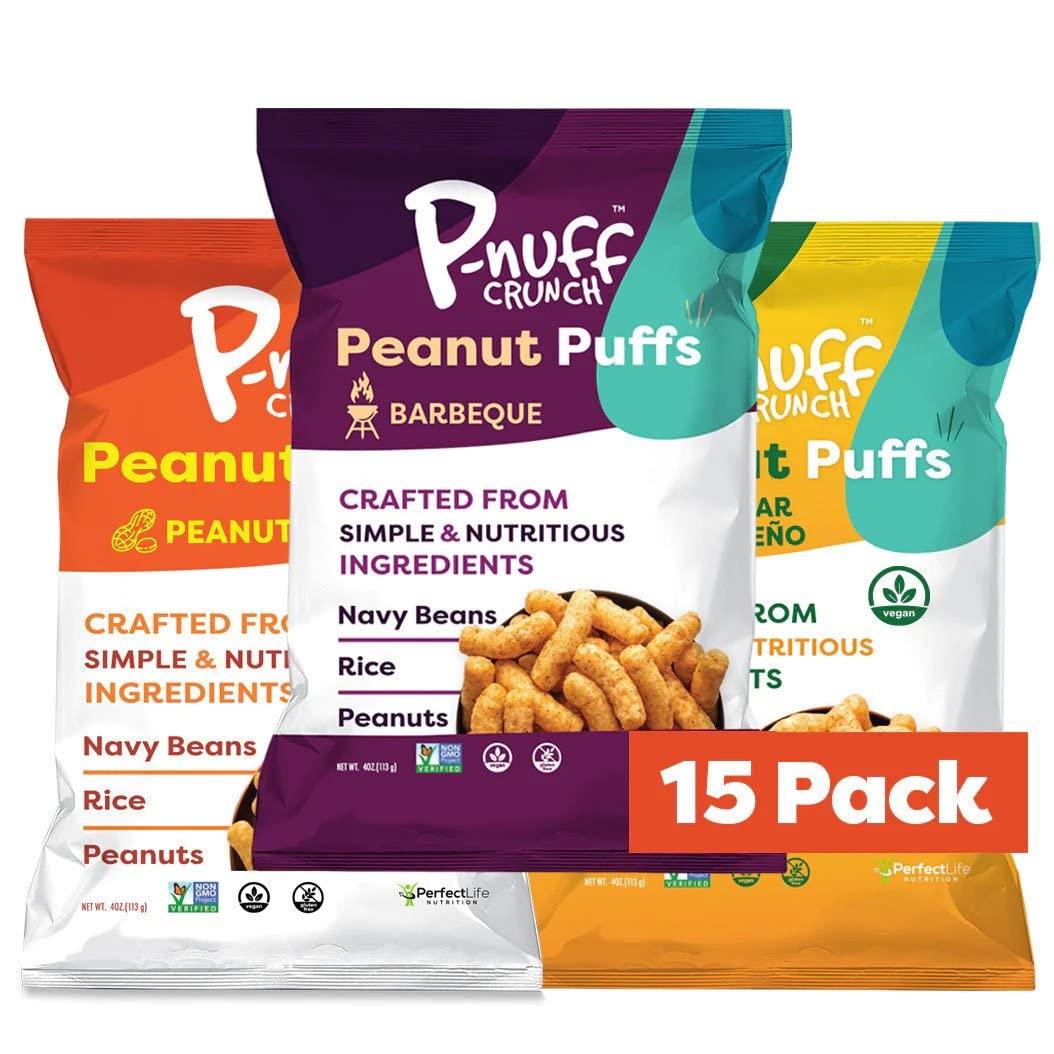 - HIGH PROTEIN SNACKS P-nuff Crunch protein puffs contain 5g plant-based protein (per serving) sourced from peanuts, navy beans, brown rice, & contains all 9 essential amino acids to help build muscle